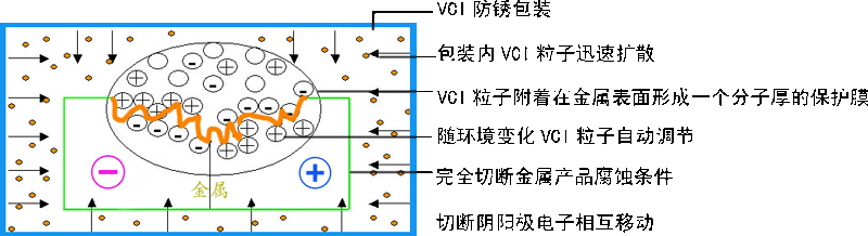 VCI是英文(Volatile Corrosion Inhibitor)的縮寫,它是一種具有揮發(fā)性的腐蝕抑制劑,簡稱為氣化性防銹產(chǎn)品。當用氣化性防銹產(chǎn)品包裝好被包裝物以后,防銹產(chǎn)品的防銹粒子氣化成氣體,吸附在金屬表面形成保護膜,切斷金屬離子與水、氧氣接觸的可能性,有效抑制了金屬腐蝕電化學(xué)反應(yīng)的發(fā)生,從而達到防銹效果。包裝后內(nèi)部的防銹粒子的氣化擴散量自動調(diào)節(jié),當濕度或溫度增大時,防銹粒子的擴散量也會加大, 反之,防銹粒子的擴散量會減小,從而來自動調(diào)節(jié)包裝物內(nèi)部的氣體濃度,讓包裝物始終處于一種最穩(wěn)定的防銹狀態(tài)。
